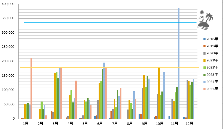 各月一番右にあるオレンジ色のグラフが2025年の実績。